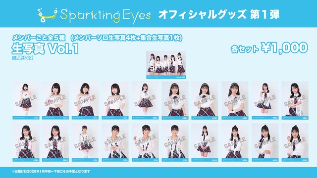 つんく♂作詞・作曲なのにスーパーインディーズアイドル 「Sparkling Eyes」よりオリジナルグッズ第1弾が販売開始! 【Sparkling Eyes】生写真 Vol.1 各メンバーごとの5種類で、4枚の個別生写真+集合生写真1枚の計5枚のセットです。 クルクル・菅原咲来・西玲名・瑞生みゆ・美南里歩からご希望のメンバーのセットをお選びください ※お届けは1月中旬〜下旬予定となります。