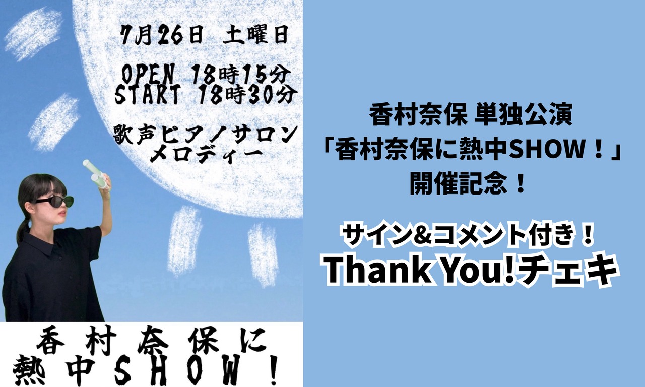 7月26日に歌声ピアノサロン メロディーにて開催の「香村奈保 単独公演 『香村奈保に熱中SHOW!』」の開催を記念したThank You!チェキの販売です!イベント当日に撮影したチェキに、香村奈保のサイン・メッセージを添えてお届けします!