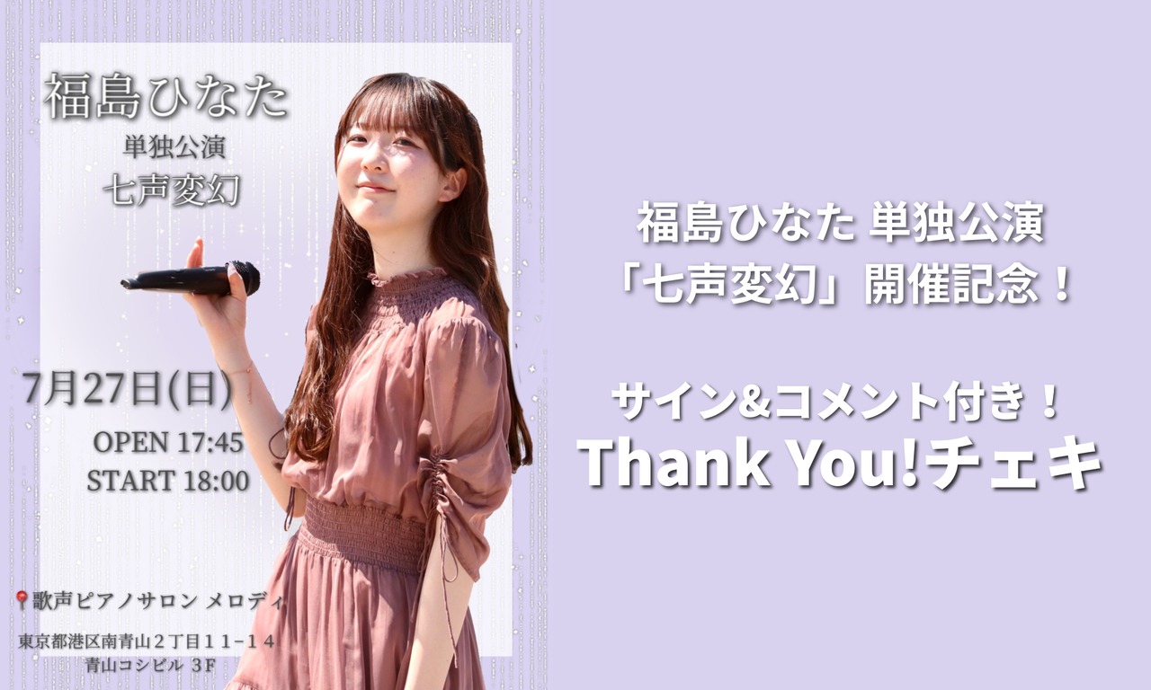 7月27日に歌声ピアノサロン メロディーにて開催の「福島ひなた 単独公演 『七声変幻』」の開催を記念したThank You!チェキの販売です!イベント当日に撮影したチェキに、福島ひなたのサイン・メッセージを添えてお届けします!